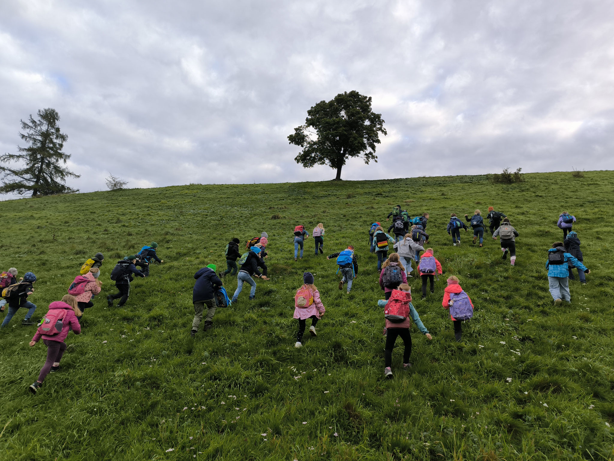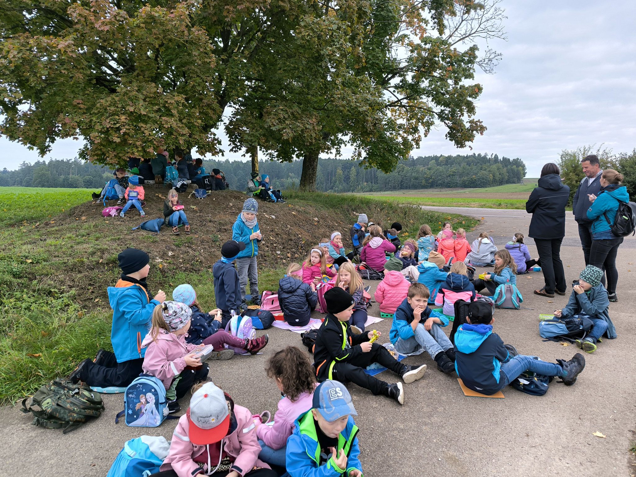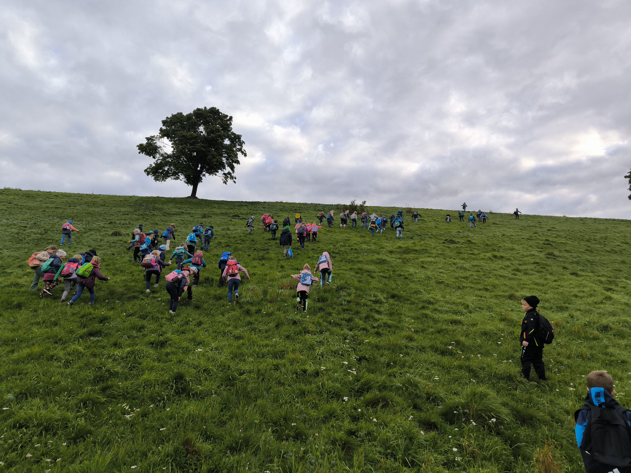 Immer ein lohnendes Ziel für den Wandertag der 1. und 2. Klasse ist die Gaststätte der Familie Schneeberger. So machten sich die drei Klassen mit ihren Lehrerinnen Frau Götz, Frau Sperber und Frau Glas am 29.09.2025 über die Wiesen- und Waldwege auf den Weg nach Altmannsberg. Begleitet wurde die Wandergruppe außerdem von Hausmeister Herrn Lengenfelder.
